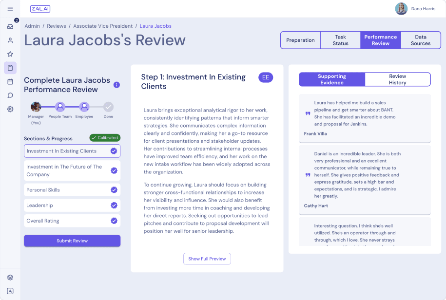 “I’ve been through enough performance reviews to know they’re usually stressful, time-consuming, and prone to recency bias. Zal changes that by turning the work I'm already doing...1:1s, goal-setting, and feedback, into evidence-based drafts, so it's easy to provide feedback that leads to growth..”