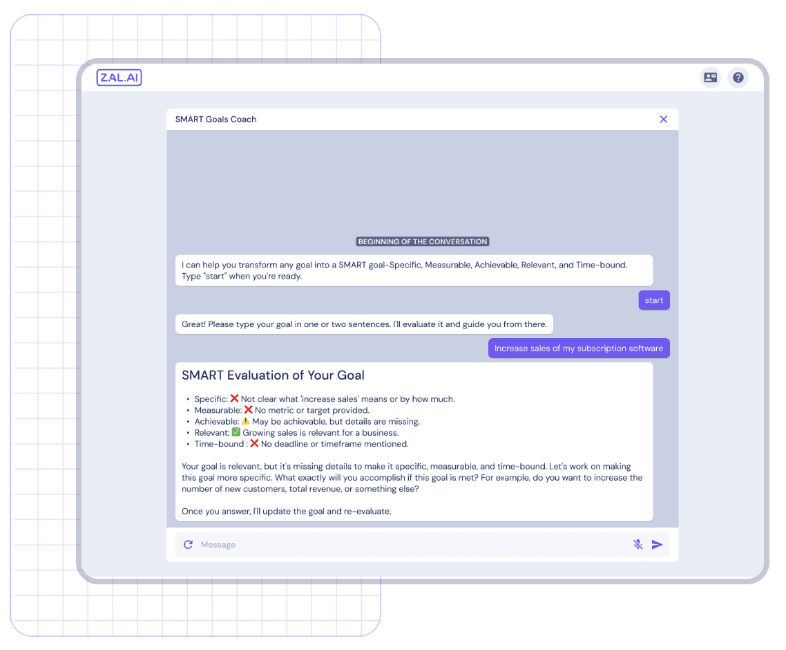 Performance isn't a once-a-year event. It's the daily rhythm of setting goals, giving feedback, and tracking progress. Zal's AI learns your company context, adapts to each manager's team, and personalizes the experience for every employee in a simple inbox—so everyone gets clarity, not noise.