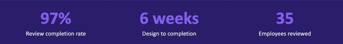 A 97% completion rate on a first-ever review cycle is, to put it plainly, exceptional. In Desiree's experience, there is always a subset of employees who simply don't finish. Not here.